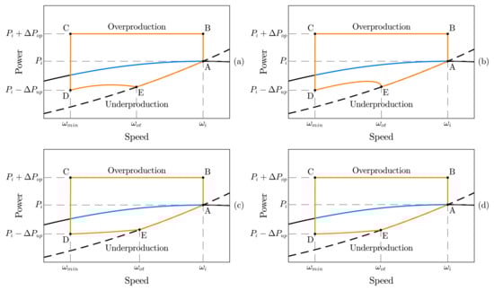 In [53] another control logic is proposed, as shown in Figure 11b. The difference from the method depicted in Figure 11a lies in the overproduction mode. Instead of adding a constant power reference to the MPPT curve, the initial power reference is initially determined based on the maximum torque limit, and then it decays linearly with the rotor speed. The power curves as functions of the time and rotor speed are depicted in Figure 12c,d. When an abnormous frequency is detected, the generator power reference increases from point A to B, limited by the maximum allowable torque. Subsequently, the power reference decreases linearly with the reduction of rotor speed (B,C), with a second reference point being the MPPT reference power at the minimum rotor speed. The restoration mode begins when electrical and mechanical powers are equal, initiating rotor speed restoration similar to [52]. Comparing both control approaches illustrated in Figure 12, the second approach tends to provide higher power output for a short period, while the first method lasts longer with reduced power output. Both methods in [52,53] minimize power variation when transitioning from over- to underproduction modes and require only rotor speed information, which is readily available in wind energy conversion systems.