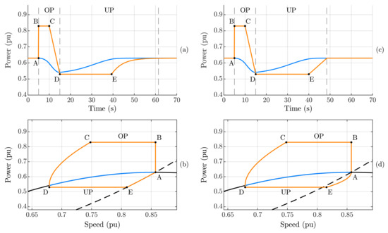 Fast power-reserve dynamics based on the strategy proposed in [52] (a,b) and [53] (c,d). The figure depicts the generator power (in orange) and wind turbine power (in blue) as functions of time (a,c) and rotor speed (b,d). The dashed line in (b,d) represents the MPPT power reference, while the dotted line in (d) indicates the power reference resulting in the rated torque. Point A: initial state; Points B, C: overproduction (OP) mode; Points D, E: underproduction (UP) mode.