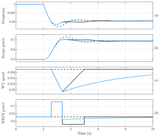 The continuous curves represent two methods of fast power response. The black curve is the system response when the method from [46] is employed. In this case, the dynamic response is activated when the frequency drops below 0.99 pu. As soon as this condition is verified, the wind generator power reference increases by 0.1 pu and is kept constant until the frequency returns to the threshold value. Then, the underproduction mode starts, and the rotor speed is recovered. It is observed that, as the response from the non-reheat steam turbine is much faster than for a hydro turbine, there is a lower need for wind frequency support. Consequently, the wind turbine rotor speed deviates less, and the power step from overproduction to underproduction mode is smaller than observed in Figure 18. As a result, a second-frequency dip is not observed. A similar conclusion is obtained by observing the blue curve, with the method from [50].