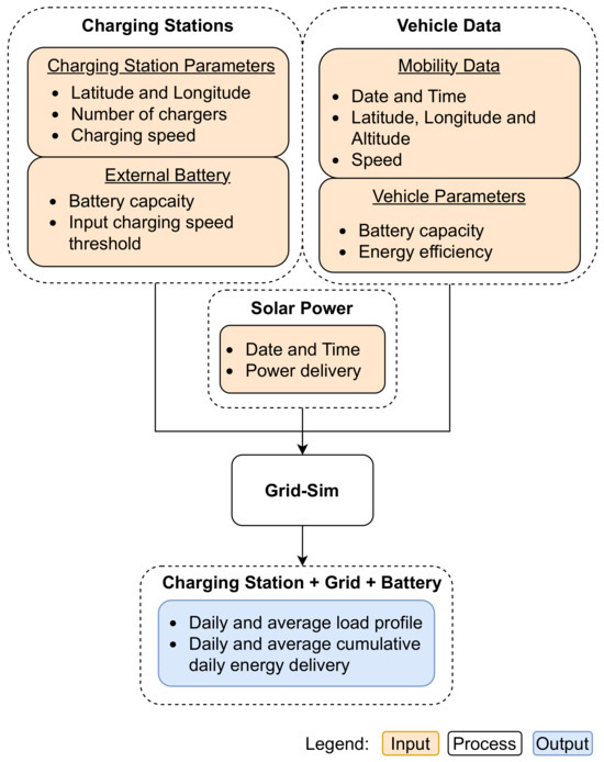 Due to limited data availability, the tool must have the least possible input requirements. As a minimum, Grid-Sim only requires vehicular data (vehicle parameters and mobility data) and charging station parameters. In the context of this study, additional input data regarding the external battery and solar PV installation are required. The exact parameters used for each input entity in this paper are stated in Section 3.2.