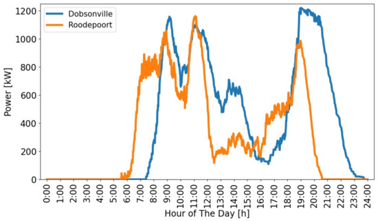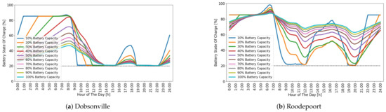 The external battery capacity iterations were chosen according to the number of electric taxis charging at each taxi rank and an electric taxi’s battery capacity. Increments of 10% were chosen, where the battery capacity of an electric taxi is 100 kWh as previously stated. Thus, Dobsonville has external battery increments of 1140 kWh for its 114 taxis, whereas Roodepoort has 880 kWh increments for its 88 taxis.