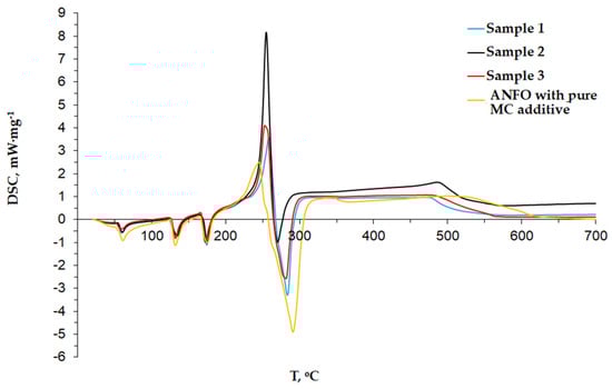 | Sample | MC or MC-Fe | Average Energy of Explosion, J·g−1 | Maximum Deflection, % |