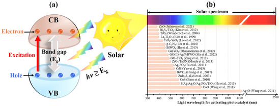Activation of photocatalysts under solar light. (a) Generation of electron and hole; (b) light wavelength required for activating different photocatalysts [8,20,21,22,23,24,25,26,27,28,29,30,31,32,33,34,35,36,37].