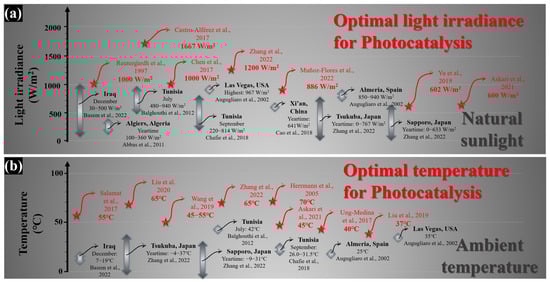 Comparison of optimum photocatalytic reaction conditions with natural conditions. (a) Light irradiance [7,38,39,40,41,42,43,44,45,46,47,48,49]; (b) temperature [7,10,40,45,46,47,49,50,51,52,53,54].