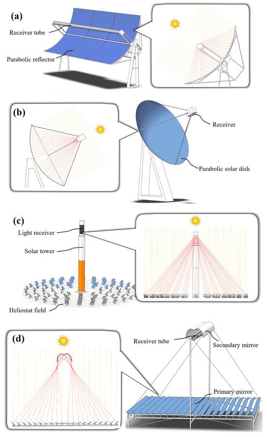 Schematic diagram of major concentrated solar power (CSP) technologies. (a) Parabolic trough reflector (PTR); (b) parabolic dish reflector (PDR); (c) solar power tower (SPT) and (d) linear Fresnel reflector (LFR).