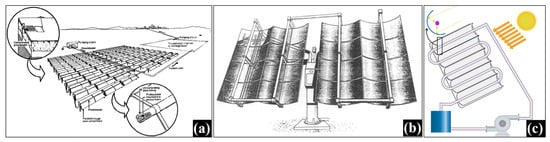 The PTR might be the most common and widely deployed CSP technology. As shown in Figure 3a, the most important technical feature of the PTR is that it is equipped with a parabolic-shaped concentrator mirror and a receiver tube located at the focal line of the parabola [45]. Owing to the optical properties of the paraboloid, it can efficiently focus incident parallel sunlight onto its focal line. This capability allows the receiver to harness a substantial amount of light energy, subsequently converting it into a concentrated heat flux. In order for the parabolic mirror to accurately converge parallel solar rays, the aperture of the parabola must always face the incidence direction of sunlight accurately. Therefore, parabolic mirrors are usually equipped with a controlling system to track solar motion. Due to its simpler structure compared with other CSP technologies, PTR has been successfully applied in various application scenarios. The most interesting application of PTR might be in the field of solar thermal power generation [55]. By concentrating a large amount of light and heat energy, the thermal medium (such as thermal oil and molten salts) in the receiver tube is heated, thus heating the water into high-temperature steam, which drives the turbine to generate electricity. Additionally, the solar cooking system also consists of an aluminum reflector with a vacuum tube, which provides a suitable cooking temperature of over 200 °C under actual solar conditions [56]. Moreover, the systems employed for desalination were also established by combining the PTR with an evacuated tube [57]. Furthermore, a PTR-based solar adsorption refrigeration system was also investigated, which used olive waste as the adsorbent and methanol as the adsorbate [58]. Other applications of PTR include but are not limited to photo-thermal direct sterilization systems [59], photoelectrochemical reactors for contaminant removal [60], photo-Fenton reactors [61] and industrial process heat [62]. These applications demonstrate the wide applicability and flexible deployability of PTR technology.