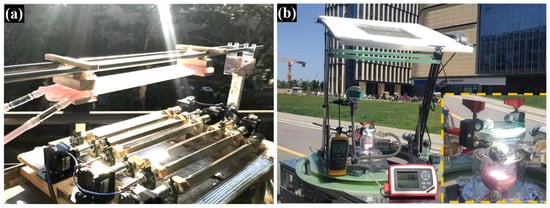 Linear Fresnel reflectors, due to their excellent solar energy harvesting capabilities and widely acknowledged low costs, have also shown strengths in the structural exploration of photocatalytic systems. Zhang et al. developed an LFR-based photoreactor for the photocatalytic treatment of various organic contaminants including organic dye, antibiotics and pathogenic microorganisms (Figure 6a) [7]. In this system, six flat primary mirrors were mounted on the pedestal of the reactor and driven by stepper motors. The system was located in the north–south direction, with the primary continuously tracking and reflecting solar rays to the reaction tubes. The quartz glass reaction tubes were located above the primary mirror array, which could be moved in a north–south direction to accommodate the solar altitude angle in different seasons. Different from previous studies employing TiO2 particles, this LFR-based photoreactor utilized TiO2-coated silicone beads as the photocatalyst, which filled the inside of the reaction tubes. Rhodamine b, amoxicillin and Escherichia coli were successfully eliminated under actual weather conditions including a sunny day, cloudy day and rainy day, which demonstrated the feasibility of the LFR configuration for providing solar energy to photocatalysis. In addition, Zhang et al. also reported the fabrication of an LFR-based microalgae biorefinery system [1]. Six flat mirrors were deployed as the primary mirror array for providing the solar flux to a transparent reaction box. The photocatalytic meshes, which were arranged in a stack, were installed inside the reaction box for receiving the reflected solar light. The microalgal solution could flow through the photocatalytic meshes and be destroyed by the photocatalytic effect, thereby achieving the release of carbohydrates, proteins and lipids. Moreover, Ma et al. carried out a hydrogen formation experiment through the photocatalytic conversion of aqueous urea and urine employing a Fresnel lens (FL) (shown in Figure 6b) [83], which provided ultra-high light irradiance (15,000 W/m2) and a temperature close to the boiling point of water (93 °C). A cascade reaction of heat-triggered urea hydrolysis and thermally assisted ammonia photolysis was established, which resulted in a high hydrogen formation efficiency.