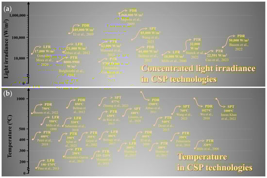 Solar thermal energy provided by typical CSP technologies. (a) Concentrated light irradiance [45,49,62,69,70,72,103,104,105,106,107,108,109]; (b) temperature [18,19,44,49,62,63,68,69,71,72,104,106,108,110,111,112,113,114,115,116,117,118,119].