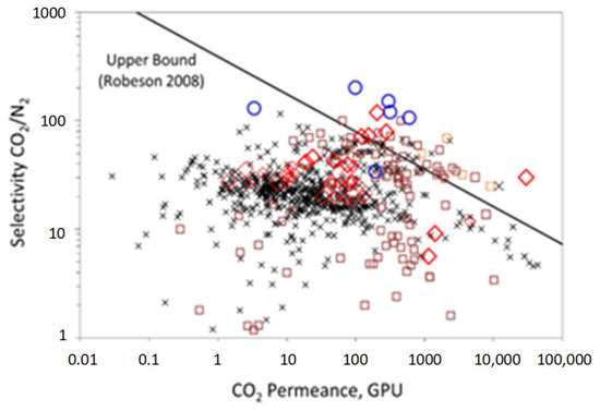 To be compatible with the conventional CO2 capture methods, membranes need to have a high permeability of carbon dioxide and efficient selectivity for the CO2 separation method to occur. Permeability and selectivity are traded for the majority of polymeric membranes, in a process which is known as “the Robeson upper-bound” [24], see Figure 1. The modified upper bound has an enhanced bound, because of notable advances in the performance of membranes since the previous upper bound was set in the 1950s [25].