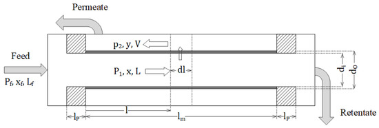 Solution-diffusion is believed to be a mature technique to characterize the method of multi-component gas mixture penetration via polymeric membranes. Nowadays, polymer membranes have become the most manufactured membrane material due to their affordable pricing and straightforward large-scale manufacturing [37,38]. The differential equations for the membrane system can be derived by harnessing CO2 and N2 mass transfer and total mass transfer [39,40,41]. Figure 2 presents the scheme of feed, permeate, and retentate streams in a module of counter-current flow.