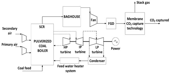It is commonly concurrent that membrane surface area and the energy required for compressors are the essential elements that define membrane technology cost [49]. Characteristics of the 330 MW CFPP, fuel used, and the flue gas generated are presented in Table 1. The scheme of the CFPP with a CCS in the present paper is illustrated in Figure 3 [50].