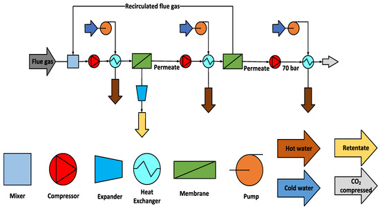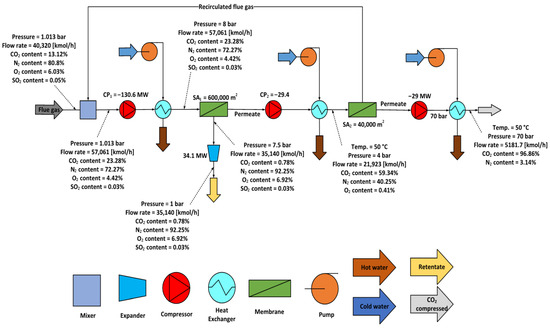 According to Koros et al. (1987), for the goals of high efficiency and purity in a multi-stage membrane carbon dioxide removal process, a steam cycle scheme is required for the scheme design [54]. Thus, for the process design, the residue stream from the second membrane is sent back before the first compressor designed to reduce the carbon dioxide emissions, therefore increasing the CO2 capture rate. Furthermore, two different compressor units before each membrane stage and an expander in the first membrane retentate stream were considered to evaluate the optimum result and the total CFPP performance, as presented in Figure 4 [55].