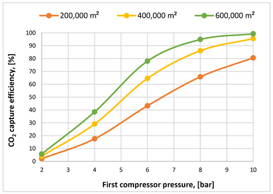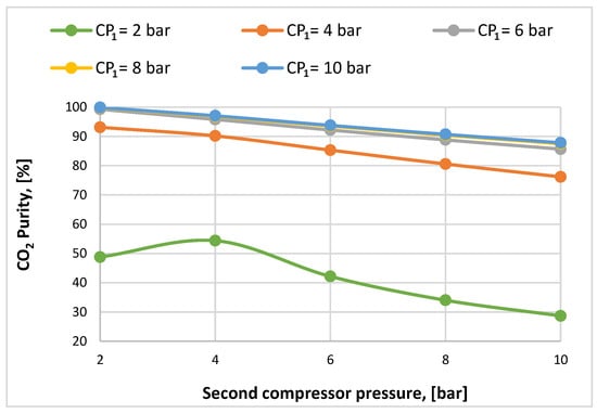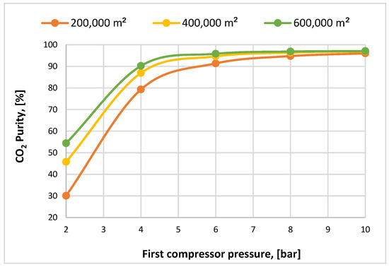 The research purpose is to study different CO2 capture system parameters integrated into a conventional CFPP (using hard coal as a fuel) of 330 MW as a net output power to recover 90% of the carbon dioxide emissions; the recovery efficiency value (90%) was set as a standard CO2 capture efficiency by the U.S. DOE National Energy Technology Laboratory (NETL) [35], with a purity of 95% with the lowest LCOE. This purity is demanded for transportation and applications like enhanced oil recovery (EOR) [36]. Using process modeling, various scenarios were examined to determine how feed compression and membrane surface area affected the membrane system’s productivity and the total cost.
