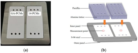 The experiments are divided into two cases: with and without PCMs. Additionally, in order to compare the influence of different lattice structure on the heat transfer characteristics of ITPS, an experimental model as shown in Figure 1 was created. The left cavity of the metallic base was filled with an alumina ceramic component containing a Gibson–Ashby lattice (GA) to obtain GA-ITPS. The right cavity of the metallic base was filled with an alumina ceramic component containing a tetradecahedron lattice [14] to obtain 14-ITPS. The porous lattice units in the alumina ceramic components had a porosity () of 0.75, and the cell size was 8 mm. The flat plate in the alumina ceramic component served as the inner plate of ITPS, while the bottom panel of the metallic base served as the outer plate of ITPS. The thickness of both plates was 2 mm. The dimensions of the two cavities in the metallic base were 76 mm × 36 mm × 10 mm. PCM was filled through the holes on the inner plate, resulting in GA-PCMs when combined with the GA lattice, and 14-PCMs when combined with the tetradecahedron lattice.