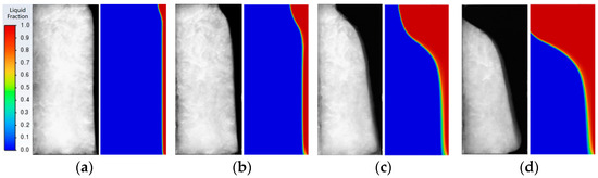 Comparison of solid–liquid phase distribution: Babak’s experimental results [35] (left) and our simulated results (right). (a) t = 10 min; (b) t = 20 min; (c) t = 40 min; (d) t = 60 min.