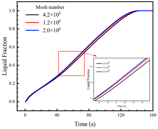 In this study, we employed a GA-ITPS model with a lattice pore of 8 mm. Three simulation models were established with grid quantities of 4.2 × 105, 1.2 × 106, and 2.0 × 106, respectively. The purpose was to validate the mesh independence by comparing the time-dependent liquid fraction curves obtained from these models. The results are presented in Figure 6, where the liquid fraction curves of the three grid quantities exhibit similar trends. However, upon closer examination in the zoomed-in section, a more pronounced change in the liquid fraction can be observed when the grid quantity increases from 418,286 to 1,192,057. Nevertheless, further increasing the grid quantity beyond 1,192,057 has minimal effect on the numerical simulation results. Therefore, we selected the model with a grid quantity of 1,192,057 for conducting the numerical simulations.