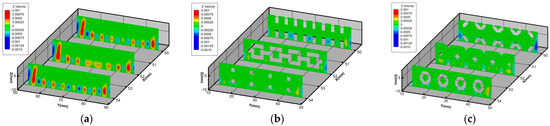 Flow velocity of paraffin at β = 0.6. (a) Pure PCM; (b) GA-PCMs; (c) 14-PCMs.