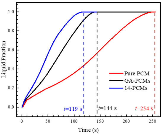 The effects of lattice structure on the melting rate of PCMs was investigated through numerical simulations. The liquid fraction variation of paraffin in different lattice structures is shown in Figure 12. Pure paraffin completely melts at t = 254 s. GA-PCMs reach complete melting at t = 144 s, reducing the melting time by 43.5% compared to pure paraffin. Similarly, 14-PCMs achieve complete melting at t = 119 s, shortening the melting time by 53.1% compared to pure paraffin. Despite the paraffin content in PCMs being only 25% lower than pure paraffin, the melting time differs by nearly twice as much. Therefore, incorporating a porous lattice in paraffin significantly reduces the required melting time.