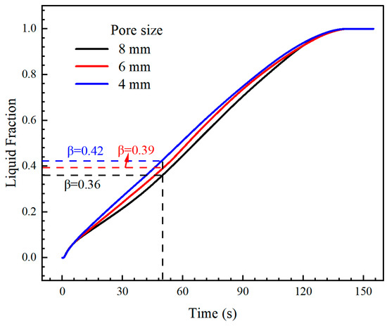 The variation of liquid fraction with different pore sizes of GA-PCMs is depicted in Figure 13. During the early to mid-stage of melting, smaller pore sizes result in faster melting rates and higher liquid fractions. For instance, at t = 50 s, the PCMs with an 8 mm pore size had a liquid fraction of 0.36, while the PCMs with a 6 mm pore size had a liquid fraction of 0.39, and the PCMs with a 4 mm pore size had a liquid fraction of 0.42. This can be attributed to the scarcity of liquid paraffin during the early to mid-stage of melting, which weakens the natural convection effect within the PCMs, as illustrated in Figure 14a. Consequently, heat transfer primarily occurs through conduction, and thus, smaller pore sizes with a larger surface area exhibit stronger heat transfer capability. In the later stage of melting, as the proportion of liquid paraffin increases, natural convection becomes more prominent. As shown in Figure 14b, lattices with larger pore sizes exhibit stronger natural convection. Therefore, in the later stage of melting, PCMs with larger pore sizes melt at a faster rate.