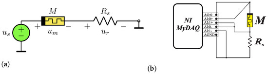 SDC (Self-Directed Channel) memristors with tungsten, tin, chromium, and carbon doping were tested and compared with each other during the tests. In order to measure the memristor current and to limit it below its nominal value, i.e., 1 mA for W, Sn, and Cr-doped memristors and 50 µA for C doping [21], the memristor was connected in series with a high quality linear resistor . In the case of W, Sn, Cr doping, the resistance was while in the case of C doping, was . The voltage measured at resistor , according to Ohm’s law, is directly proportional to the current and its known resistance, which allows the memristor current to be obtained by multiplying the voltage across the resistor by the reciprocal of its resistance. The conceptual diagram of the measurement system is shown in Figure 2a. All tested memristors were prepared using the same forming procedure before the tests began. With the myDAQ University Kit from National Instruments containing a measurement board and function generator, the supply voltage was generated and the and signals were collected [24]. The current of the memristor were calculated using Ohm’s law . The circuit connection diagram for the measuring device is shown in Figure 2b. For the AC analysis tests conducted in Section 3, the sampling rate of the acquisition signal depended on the frequency of the forcing signal, so that 1000 points were collected for each signal period. The relation between sampling rate and the forcing signal frequency can be expressed as: