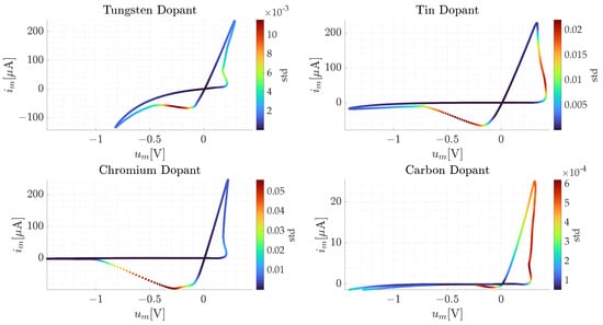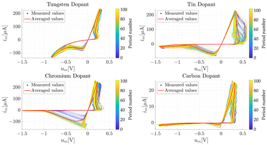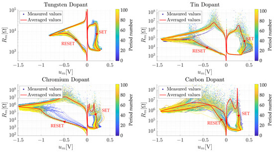 One of the fingerprints of memristors is their specific response on periodic signals [1]. When the periodic signal with zero mean is applied (current or voltage) all memristors must exhibit a characteristic hysteresis loop pinched at origin of domain. This phenomenon is said to provide necessary and sufficient conditions for identifying experimentally whether a device is a memristor, or not [28,29]. In Figure 4, the characteristic hysteresis loops on domain for each SDC memristors considered in the work are presented. The amplitude and frequency of the generating sine signal was and accordingly. It can be noticed that SDC memristors are unstable during the switching process both from the OFF state (high resistance) to the ON state (low resistance) and v.v. For clarity of the observation the averaged signal over all 100 periods of the generation signal has been presented, here indicated by the red line. To illustrate the evolution of the memristor’s hysteresis loop during the course of the investigation, the measurement points was colorized using a gradient based on the sequential number of signal periods. As observed, the characteristic of the memristor undergoes changes with successive periods of the driving signal, indicating a correlation with the supplied energy, i.e., the temperature of the memristor. This phenomenon is particularly pronounced in the case of Chromium-doped memristors. The comprehensive study over the variations of the memristors behavior with temperature has been studied in [22]. On Figure 5 the calculated STD (standard deviation) factor from the average has been presented. Looking at STD values one can assume that the most stable switching might be considered the memristor with carbon dopant where the STD factor does not exceed on the other hand the chromium doped memristor where the STD factor reaches values of . It is worth to notice that deviations from the average are higher during the resetting process. This phenomenon can be seen on Figure 4. The exception is the memristor doped with Tin where some unstable behavior are noticed during the setting process. Significant deviations from the referenced characteristics can also be seen at the final periods, so trivially it is hard to separate two different transition characteristic, based only on electric energy provided to the memristor. On the other hand after set and reset process all memristors reaches stable state condition what is the most important in the field of RRAM application.