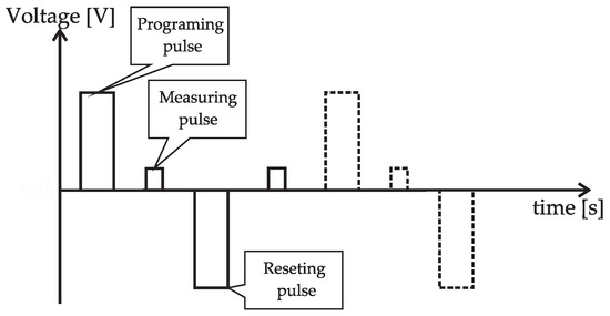 The programming process of the circuit shown in Figure 2b was carried out by supplying the memristor with appropriate pulses: programming pulses (with positive polarization), measuring resistance (at low amplitude, below the threshold voltage of the memristor), and resetting pulses (with negative polarization). The tests pulses for the resistance measurement uses the property of the memristors that below some threshold voltage the memristor state, i.e., its resistance stays unchanged. The conceptual process of setting and resetting the memristor is illustrated in Figure 7.