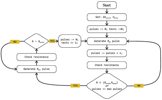 The block diagram of the testing process is presented in Figure 8. The main concept of the algorithm is to generate programming pulses until the state is achieved, i.e., the memristor’s resistance is within the specified range. The resistance ranges have been experimentally determined and based on previous studies of the memristor response to various pulses, and they are as follows: