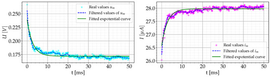 In Figure 9, the current waveform and voltage waveform during the programming pulse with a pulse width of 50 [ms] and an amplitude of 1.5 [V] are presented. As observed, the waveforms can be approximated fairly well with an exponential function, as demonstrated in the figure. It is evident that the programming was successful, as both current and voltage have stabilized in a low-resistance state. The application of the Savitzky–Golay smoothing filter is apparent, leading to the smoothing and noise reduction of the obtained data.