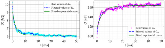 In Figure 10, the resistance waveform and the conductance waveform of the memristor during the programming pulse are presented, with a pulse width of 50 ms and an amplitude of 1.5 V. These waveforms are also exponential, as demonstrated by fitting the waveforms to an exponential curve.