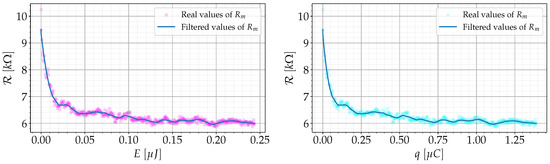 In Figure 11, the evolution of resistance of the memristor is presented in the domain of supplied energy E and supplied charge q to the memristor during the programming pulse.