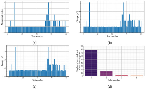 In Figure 12a, the number of pulses after which each test was concluded is presented in the form of a bar chart. It can be observed that a portion of the tests was completed after the first pulse, while there are tests that concluded after a number of pulses exceeding one. In Figure 12b, a cumulative charge delivered to the memristor during the test is presented in the form of a bar chart. Figure 12c shows a chart representing the energy dissipated in the memristor during the test. As can be observed, these charts are clearly correlated with the chart in Figure 12a. In Figure 12d, a bar chart is presented, showing the number of tests that concluded after a given pulse. It can be observed that the first pulse, 76% of the tests were successful.