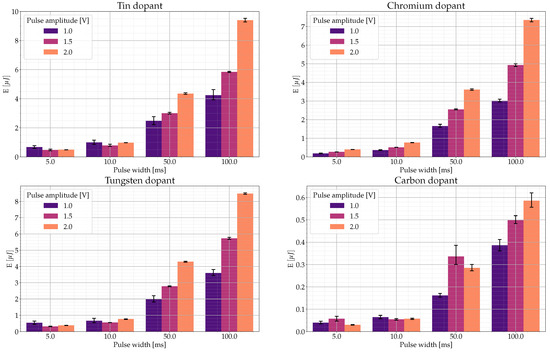 To compare the results of bi-stable programming research, several comparative graphs were created. In Figure 13, the averaged energy required to write one bit is presented in the form of a bar chart, depending on the doping of the memristor, pulse width, and pulse amplitude. Additionally, to represent the spread of results, an error bar was applied, calculated based on the confidence interval [32]. The averaged energy was computed based on the cumulative energy supplied to the memristor during a single test. As observed, the average energy needed to program one bit increases with the widening of the pulse and its amplitude. It can also be inferred that for low pulse width values, the averaged energy does not significantly increase with amplitude, and in most types of memristor doping, it even decreases, the reason for this is that there is no need for a large number of programming pulses. The spread of energy values required for writing one bit is not high.
