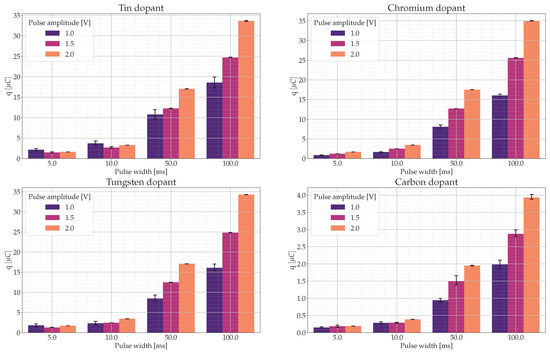 In Figure 14, the averaged charge required to write one bit is presented in the form of a bar chart, depending on the doping of the memristor, pulse width, and pulse amplitude. The charts exhibit a high correlation with the graphs in Figure 13, showing similar dependencies. This is not surprising, as energy is highly dependent on the supplied charge q.