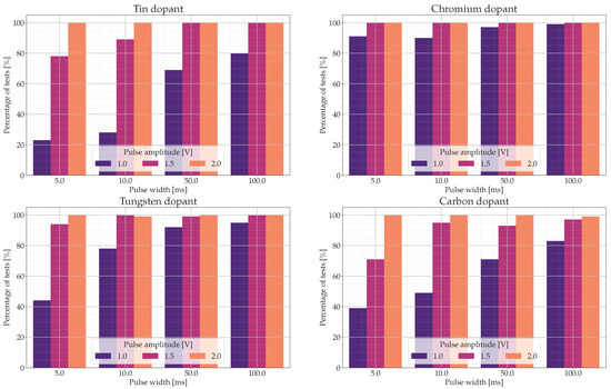 In Figure 15, a bar chart is presented, showing the percentage of tests in which the state was achieved after the first pulse, depending on the doping of the memristor, pulse width, and pulse amplitude. The registered data from Figure 15 have been aggregated and shown in Table 3. It can be observed that the percentage of tests resulting in a state change after the first programming pulse increases with the widening of the pulse and its amplitude. It is noteworthy that a high efficacy (even reaching 100%) of state switching after the first programming pulse is achieved with a small pulse width of 5 ms and a high amplitude of 2 V. It can also be inferred that the chromium-doped memristor exhibits the highest efficiency in switching between states, even for low pulse amplitudes.