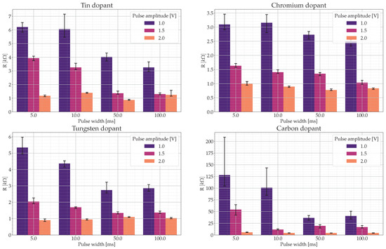In Figure 16, the averaged value of the resistance after the first programming pulse is presented in the form of a bar chart, depending on the doping of the memristor, pulse width, and pulse amplitude. It can be observed that the average resistance of the memristor decreases with the increase in pulse width and amplitude. Additionally, the memristor resistance is much more sensitive to the amplitude of the programming pulse than its width. An increase in the amplitude of the programming pulse causes a significantly higher change in the resistance value compared to an increase in pulse width.