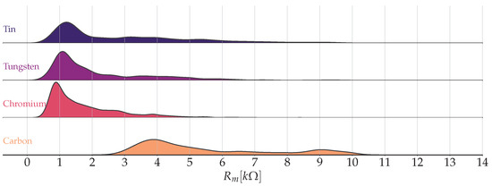 In Figure 17 the distribution of memristor resistance , after first programming pulse, divided by its doping has been shown. As can be observed, a chromium-doped memristor exhibits the lowest resistance values after the first pulse, with values concentrated most closely around the mean resistance value.