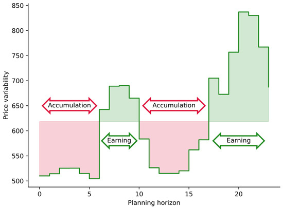 - Within the planning horizon, identify zones of ‘accumulation’ (when the energy price is below the average) and ‘earning’ (when the energy price is above the average), as illustrated in Figure 2.