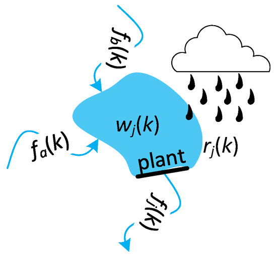 Model of hydropower plant: fa(k), fb(k)—water inflow from upstream reservoirs a and b to reservoir j with the current water level sj(k); rj(k)—water supply from exogenous sources; fj(k)—outflow supplying the plant power generators.