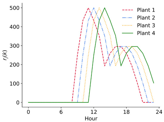 In the case of n power plants under common management (an example system with four plants illustrated in Figure 4), it is convenient to describe the model in a vector form with []’ denoting transposition. Let: