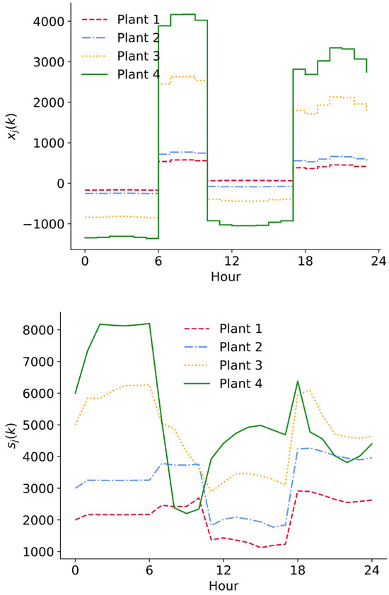 In the considered example, one observes both the accumulation of energy in the reservoirs and water release (earning). Each plant in the linked cascades 1–3–4 and 2–3–4 either throttles or magnifies the flow intensity depending on how far it is located down the river, which is intuitively justified. However, while the reservoir occupancy s(k) for the first HPs (plants 1 and 2) in the cascades is a direct integral of x(k), the further down the river, the more profound the effect of the upstream HPs and delays. x(k) and s(k) fluctuate in the opposite direction according to the external excitation in the ‘accumulation’ and ‘earning’ periods, as shown in Figure 6 (see also Figure 2). Although s3(k) and s4(k) differ much in shape from s1(k) and s2(k), they satisfy property P4, i.e., for each j, with no oscillations within each accumulation/earning period. Moreover, the components of s(k) either monotonically increase (‘accumulation’) or monotonically decrease (‘earning’), thus property P2 is fulfilled.