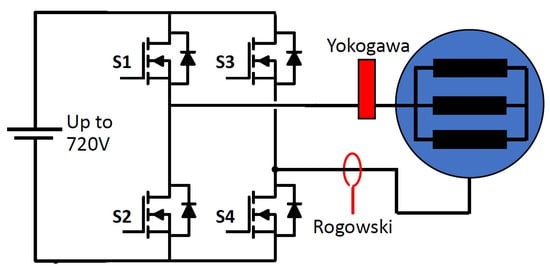 The schematic representation of the FB converter and HF sensorization developed to capture the HF common mode current is shown in Figure 4. The FB converter uses kV SiC MOSFET, with a dc-link voltage up to 720 V. The voltage applied by the FB is the same as when the three-phase inverter is commanded zero voltage (3). However, SiC MOSFET produces faster commutations than Si IGBTs. Furthermore, a voltage step up to 1440 V is now possible, compared to the voltage step of 400 V achievable with the three-phase inverter.