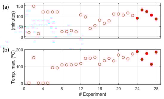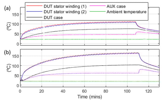 The number of experiments before failure was 28. Figure 6 shows temperatures vs. time for two of them. Both took ≈110 min, with a maximum DUT stator winding temperature of ≈110 C and ≈160 C, respectively. Figure 7 shows the duration and maximum temperature for all the experiments carried out. Further discussion on Figure 7 is presented in Section 5.