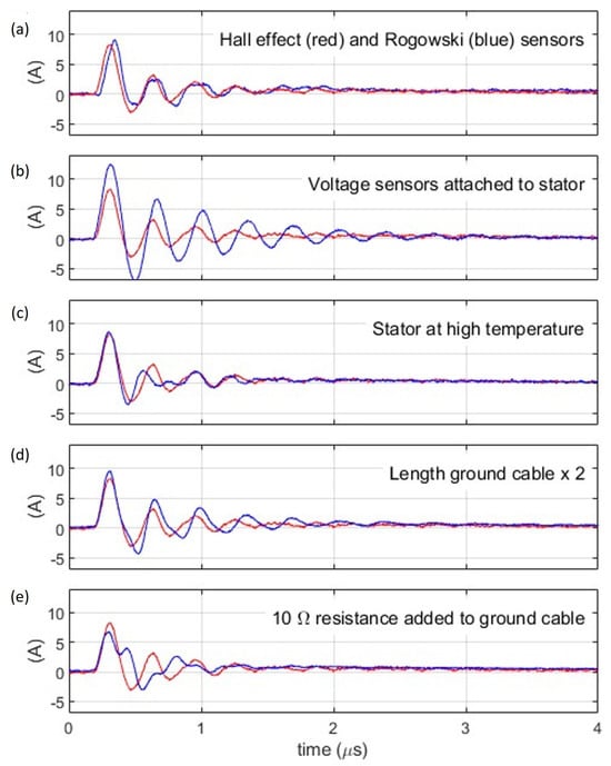 A number of experiments were performed to understand the sensitivity of the HF common mode current to operating and implementation issues. The results are shown in Figure 9b–f. All the measurements were made using the Hall effect sensor. The trace in red in Figure 9a is shown in all the cases for reference. The remaining subplots in Figure 9 show the effect of: (b) connecting Hall-effect type voltage sensors to the stator; (c) increasing the stator temperature; (d) increasing the ground cable length ; (d) adding a resistor to the ground cable.