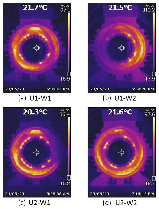 Figure 11 shows captures with the thermal imaging camera when a voltage is applied to the stator terminals indicated in the corresponding captions. The voltage was adjusted manually to obtain the nominal current. The images confirm that the insulation fault occurred in the end-winding, and not in the cables connecting the terminal box to the winding.