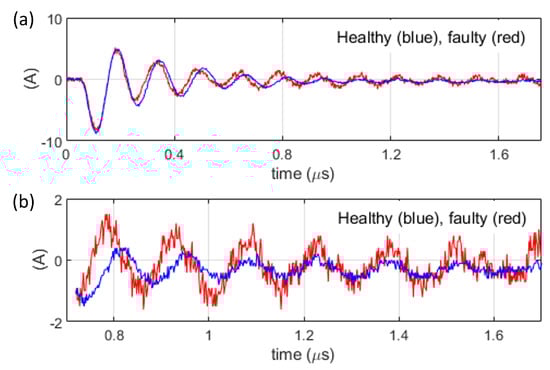Figure 12a shows the common mode current for the case of a healthy machine, and for the case when an insulation decrease was detected for the first time with the insulation tester (experiment , see Figure 7). It is noted that although the figure shows a single pulse, the response is highly repetitive.