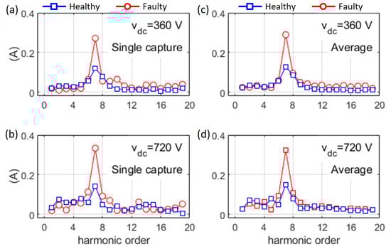Figure 14 shows the FFT of the common mode current after removing the initial part of the transient (see Figure 12b. It is noted that with the time window used in Figure 12b, the oscillation occurs at the 7th harmonic. The increase in the peak values between the faulty and healthy cases observed in Figure 14 is seen in all cases in the range of , and can be considered therefore significantly more reliable than the changes in observed in Section 6.1.