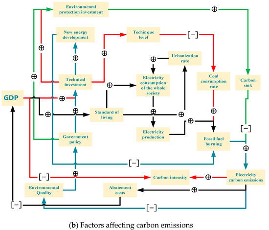 The electricity carbon emission system is a relational complex system and is influenced by various elements within the system. The system can be divided into macro-environments, such as the economy and population, and sub-environments, such as the share of thermal power and coal consumption for power generation and other power sector-specific environmental parameters. The causal relationship between the main influencing parameters is shown in Figure 2. A”“ indicates a positive correlation effect on the parameter, and a “ [−]” indicates a negative correlation effect on the parameter.