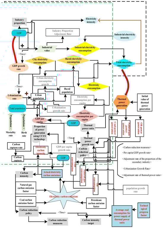 The main variables in the SD model include GDP, electricity carbon emissions, total electricity consumption, total population, thermal power ratio (power structure), electricity carbon emission intensity, coal consumption for power supply, and so on. Notably, electricity carbon emissions are directly influenced by the consumption of fossil fuels, including coal, oil, and natural gas, as well as the carbon emission coefficient in electricity generation.