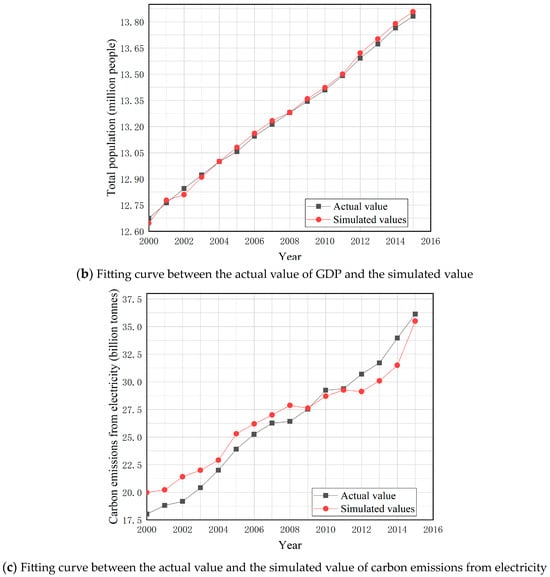 In this paper, the schematic diagram of the flow stock of the system in Figure 3 and the relevant model formulas are used to simulate GDP, total population, and electricity carbon emissions, and the validity of the model simulation results is tested by the method of historical verification. The simulation time of the system is set to 2000~2019, and some initial values of the starting time are in 2000. The model training period is selected from 2000~2015. The results of the training adjustment are shown in Figure 4.