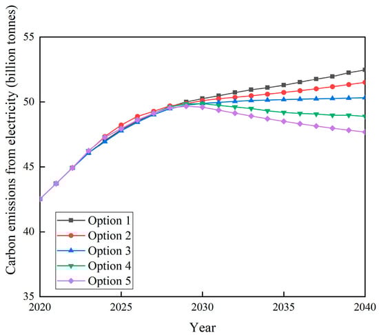 Based on the five development scenarios in Table 6, the carbon emissions of electricity under the five scenarios are projected and the corresponding carbon emissions’ projections from 2020 to 2040 are obtained, as shown in Figure 5.
